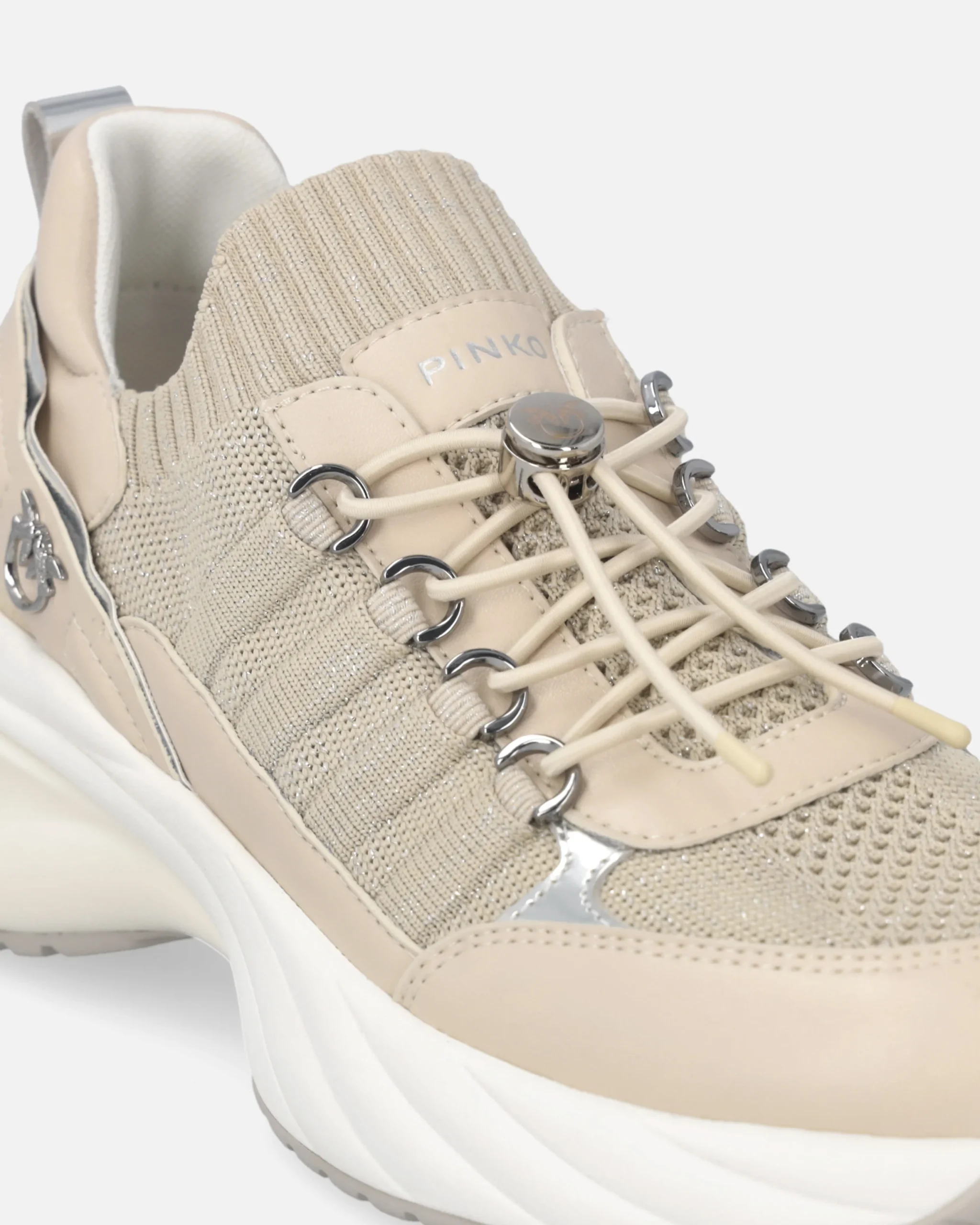 Αθλητικά παπούτσια που χαρακτηρίζονται από μια ιδιαίτερη κατασκευή από πλεκτό ύφασμα με δερμάτινα τμήματα και λεπτομέρειες από μεταλλιζέ δέρμα, ενώ τα κορδόνια στερεώνονται με στοπάκια. Τα παπούτσια είναι διακοσμημένα με το λογότυπο PINKO στη γλώσσα και το μοναδικό μεταλλικό λογότυπο Love Birds πλευρικά. Η θηλιά πίσω διευκολύνει την εφαρμογή, ενώ η χοντρή σόλα, με γυαλιστερό πίσω μέρος και λογότυπο, εξασφαλίζει άμεση άνεση. Μια πρωτότυπη εκδοχή ενός κλασικού κομματιού της αθλητικής γκαρνταρόμπας, αυτά τα sneakers δίνουν μια glam πινελιά σε κάθε casual σύνολο, με το αυθεντικό στυλ της PINKO.