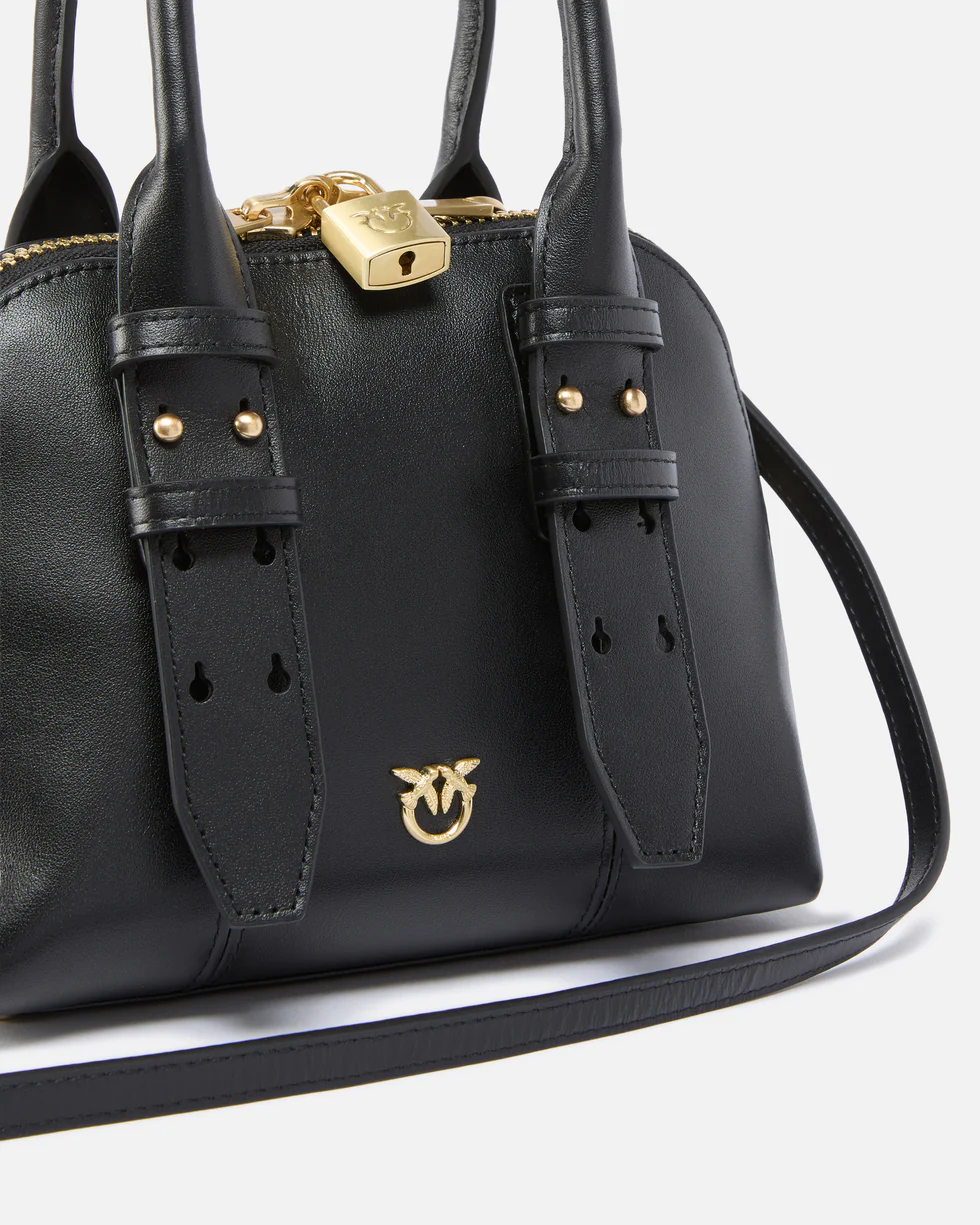 Τσάντα χειρός bowling Mini Escape Bag μικρού μεγέθους από μαλακό δέρμα, με βαμβακερή φόδρα και εσωτερική τσέπη στο τοίχωμα με θήκη για κάρτες. Το ρυθμιζόμενο δερμάτινο λουρί, καθώς και το διπλό χερούλι, που προσφέρουν τη δυνατότητα μεταφοράς στο χέρι ή στον ώμο, κάνουν την τσάντα εξαιρετικά εύχρηστη και πρακτική. Το επάνω μέρος κλείνει με φερμουάρ διπλής κατεύθυνσης και είναι διακοσμημένο με μια ξεχωριστή λεπτομέρεια: ένα λουκέτο με το εμβληματικό λογότυπο Love Birds, το οποίο ανοίγει και κλείνει με το κλειδί που περιέχεται στο δερμάτινο κρεμαστό διακοσμητικό που συνοδεύει την τσάντα. Ενεργοποιήστε την τσάντα σας PINKO: επαληθεύστε τη γνησιότητα του προϊόντος σας και αποκτήστε πρόσβαση στην εξατομικευμένη εμπειρία πλησιάζοντας το smartphone σας στο κέντημα Love Birds στην πίσω πλευρά της τσάντας!