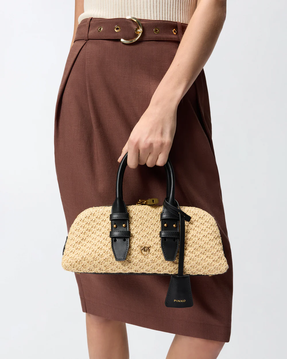 Τσάντα bowling Escape Bag Horizontal μικρών διαστάσεων, κατασκευασμένη από πλεκτή rafia. Εξαιρετικά εύχρηστη και εκλεπτυσμένη, η τσάντα διαθέτει δύο χερούλια στο επάνω μέρος για μεταφορά στο χέρι, καθώς και ρυθμιζόμενο και αφαιρούμενο δερμάτινο λουρί ώμου για να μεταφέρεται στον ώμο ή χιαστί. Το επάνω μέρος κλείνει με φερμουάρ διπλής κατεύθυνσης και είναι διακοσμημένο με μια ξεχωριστή λεπτομέρεια: ένα λουκέτο με το εμβληματικό λογότυπο Love Birds, το οποίο ανοίγει και κλείνει με το κλειδί που περιέχεται στο δερμάτινο κρεμαστό διακοσμητικό που συνοδεύει την τσάντα. Το εσωτερικό είναι φοδραρισμένο με βαμβακερό ντρίλι και έχει τσέπη στο τοίχωμα με χώρους για πιστωτικές κάρτες και έγγραφα. Ενεργοποιήστε την τσάντα σας PINKO: επαληθεύστε τη γνησιότητα του προϊόντος σας και αποκτήστε πρόσβαση στην εξατομικευμένη εμπειρία πλησιάζοντας το smartphone σας στο κέντημα Love Birds στην πίσω πλευρά της τσάντας!