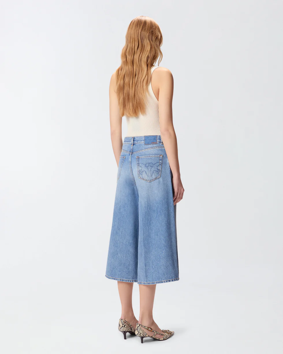 Πεντάτσεπη τζιν βερμούδα από μαλακό denim από βαμβάκι και lyocell, που χαρακτηρίζεται από ξεθωριάσματα, που δημιουργούν μια used εμφάνιση στο ύφασμα, και από μια ραφή νερβίρ στο κέντρο κατά μήκος στα μπατζάκια. Αυτό το τζιν με το αυθεντικό στυλ της PINKO είναι διακοσμημένο με κεντημένο λογότυπο του brand πίσω στη μέση και με το λογότυπο Love Birds, κεντημένο στη δεξιά πίσω τσέπη.