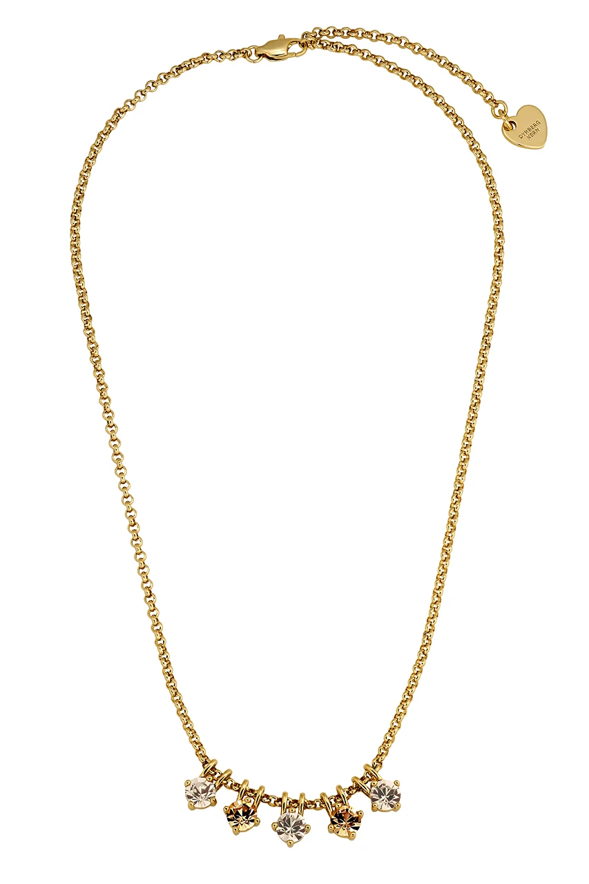 PHILA, μια κομψή αλυσίδα φτιαγμένη με πέντε στρογγυλεμένα κρύσταλλα κομμένα σε όψεις ως μενταγιόν. Συνολικό μήκος περίπου 42 cm και προέκταση 5 cm. Αλυσίδα κατασκευασμένη από ανοξείδωτο ατσάλι, μενταγιόν από γυαλισμένο ορείχαλκο. Εδώ απεικονίζεται σε χρυσό φινίρισμα με χρυσά κρύσταλλα. Δανέζικο σχέδιο χωρίς νικέλιο.