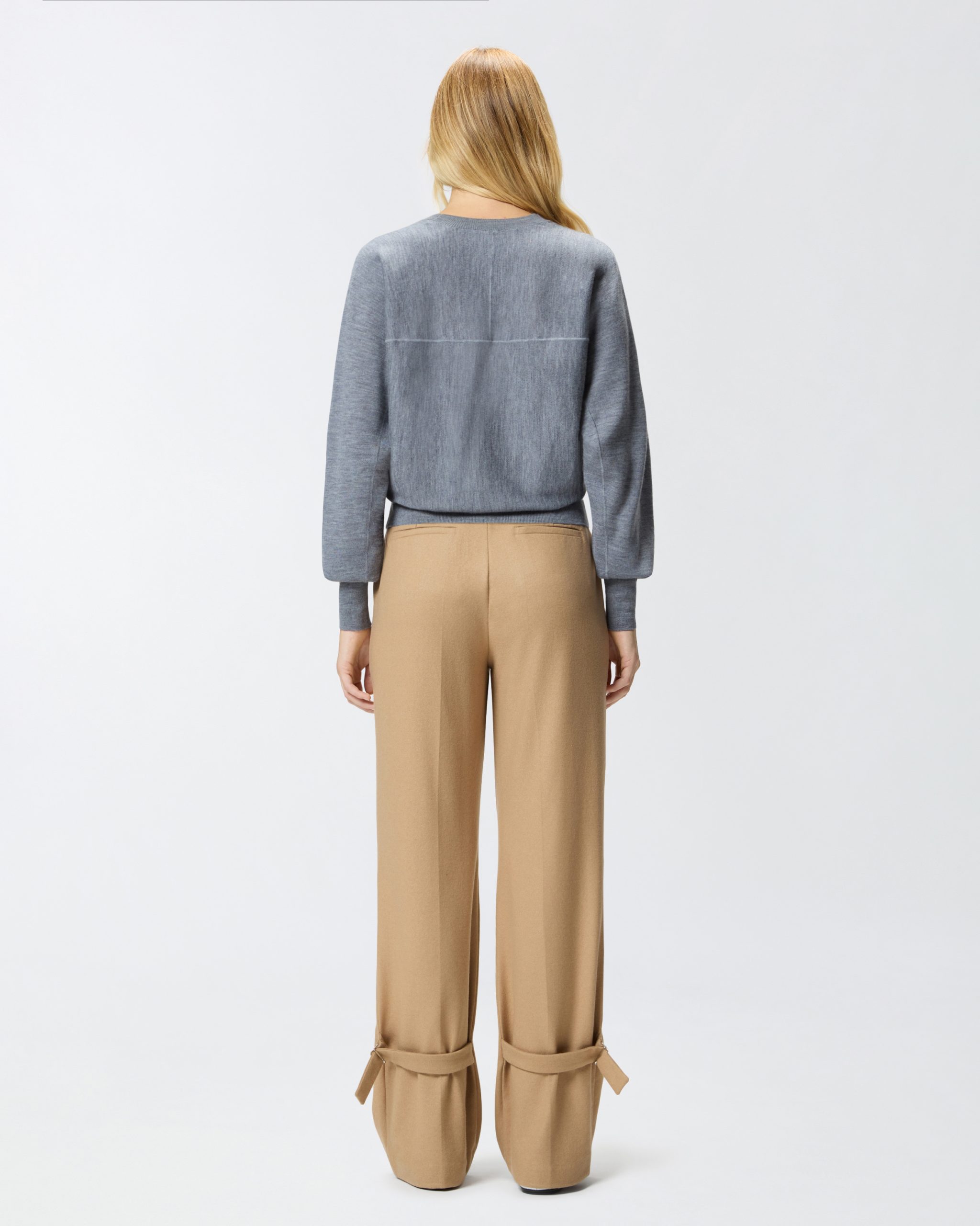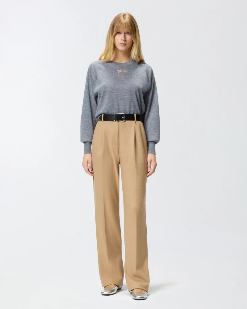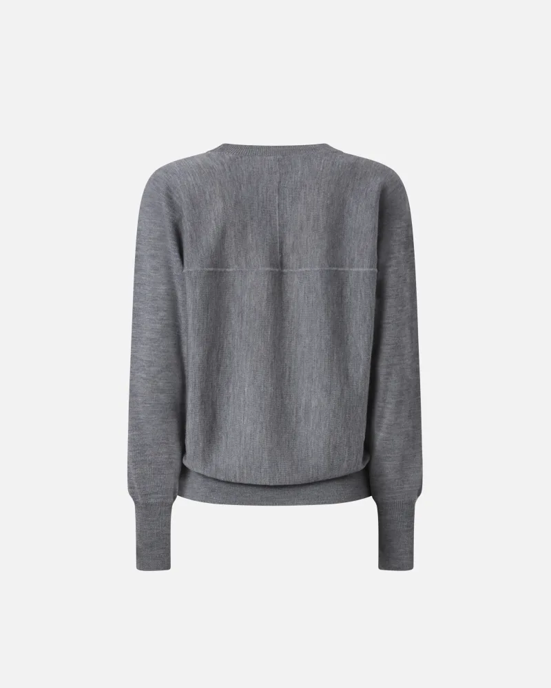 Μακρυμάνικη μπλούζα με στρογγυλή λαιμόκοψη από καθαρό μαλλί μερινός, εξαιρετικά ελαφριά και ευκολοφόρετη. Το μπροστινό μέρος είναι διακοσμημένο με το εμβληματικό λογότυπο Love Birds, σε διάφανο σχέδιο που προκύπτει με την τεχνική ντεβορέ, που εκφράζει απόλυτα το DNA του brand. Στο πίσω μέρος, ξεχωρίζει μια εξωτερική ραφή που θυμίζει το σχήμα του ωμίτη. Η λαιμόκοψη, το τελείωμα στο κάτω μέρος και οι μανσέτες έχουν ριμπ πλέξη. Το ρούχο έχει υποβληθεί σε ειδική επεξεργασία φινιρίσματος για την ελαχιστοποίηση του χνουδιάσματος, προσφέροντας μεγαλύτερη απαλότητα και ανθεκτικότητα στο ύφασμα.