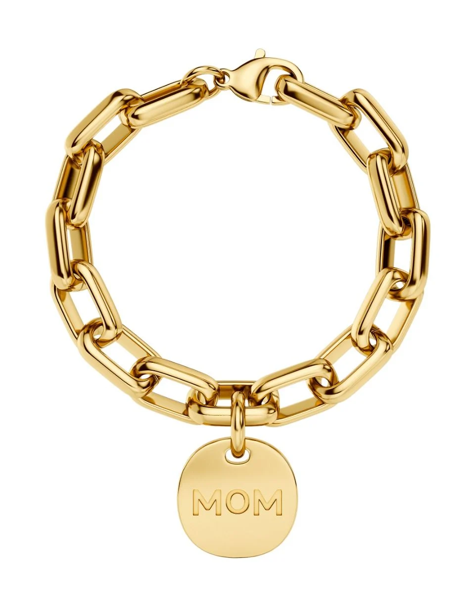 Το MOM συνδυάζει την τάση των chunky κοσμημάτων με το δημοφιλές στυλ layering, για να δώσει στη μαμά αυτή την διασκεδαστική και εκφραστική εμφάνιση. Όπως σε αυτό το έντονο βραχιόλι από επιχρυσωμένο χρυσό 14 καρατίων με ένα στρογγυλό μενταγιόν με τη λέξη MOM, σε μια υπερμεγέθη αλυσίδα. Το μενταγιόν είναι αφαιρούμενο και μπορεί να αντικατασταθεί με άλλα μενταγιόν.