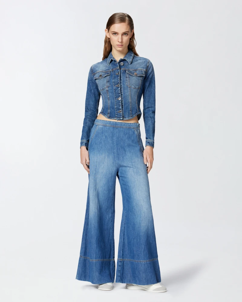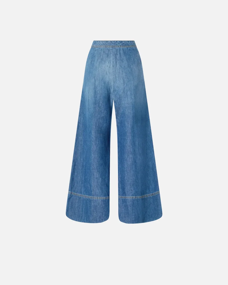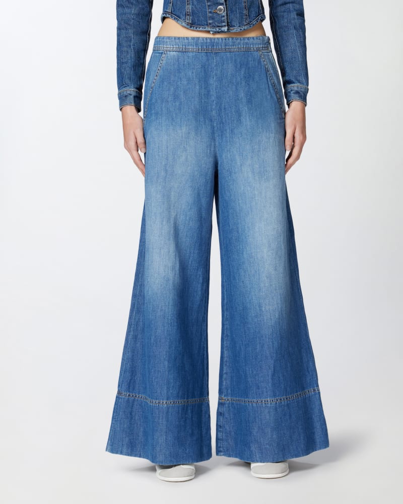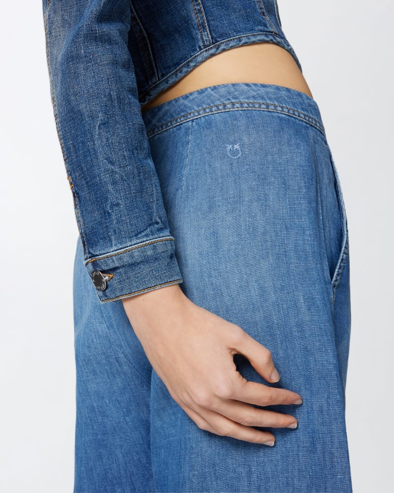 Τζιν Palazzo σε ελαφρύ τζιν από βαμβάκι και λινό χρώμα με μεσαίο σκούρο πλύσιμο. Το συγκεκριμένο ρούχο διαθέτει πολύ φαρδιά πόδια που φουσκώνουν ελαφρώς στο κάτω μέρος, τονίζοντας την εφαρμογή του palazzo και είναι ιδανικό για το καλοκαίρι λόγω του μικρού βάρους του υφάσματος. Με λοξές πλαϊνές τσέπες και χωρίς κουμπώματα, ο σχεδιασμός κάνει αυτά τα τζιν εύκολα να φορεθούν και να προσαρμοστούν με ένα τζιν πουκάμισο ή σακάκι για μια εντυπωσιακή εμφάνιση.