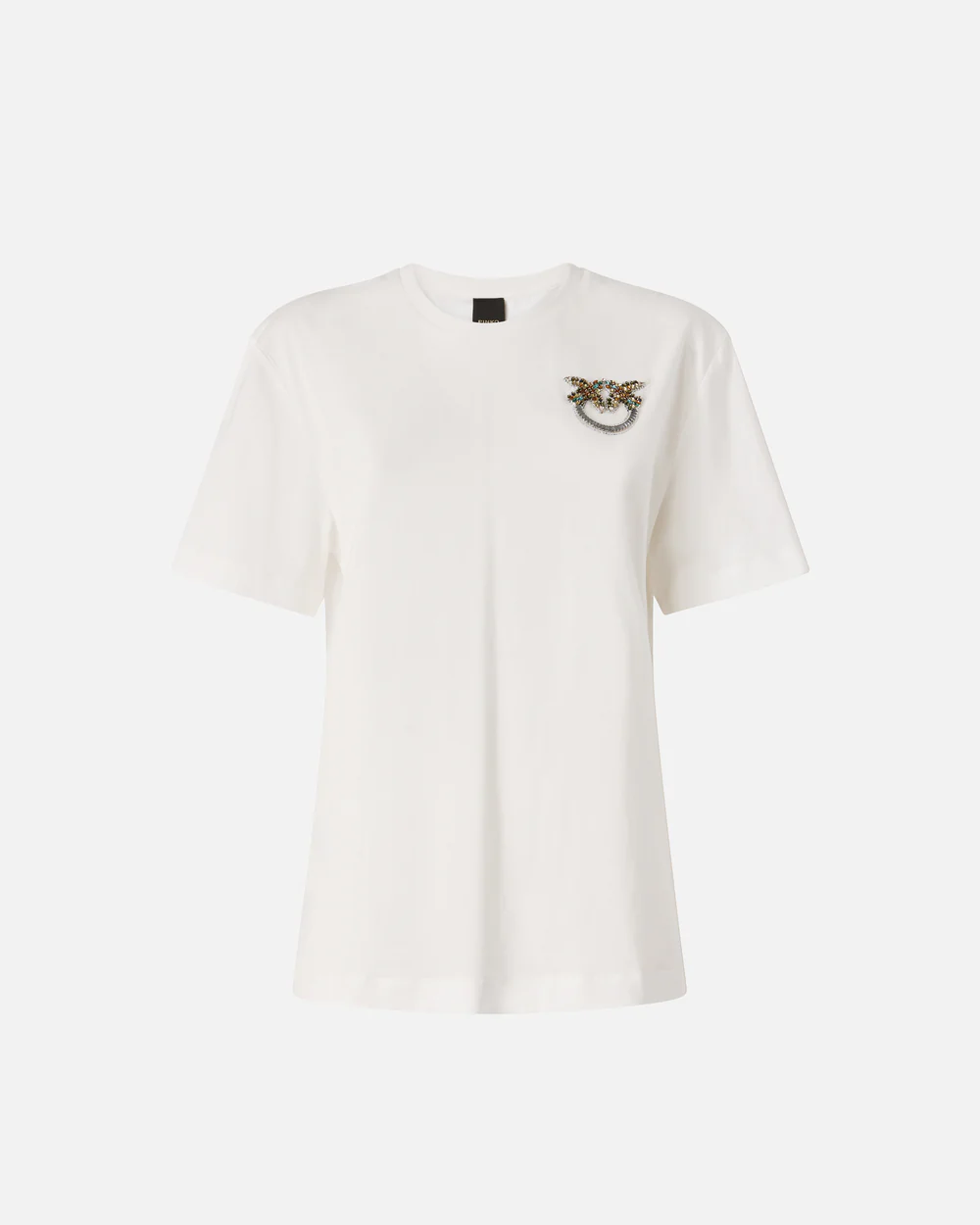 Κοντομάνικο t-shirt από απαλό βαμβακερό ζέρσεϊ ύφασμα με στρογγυλή λαιμόκοψη. Οι λιτές γραμμές του αναδεικνύονται από το κέντημα στο στήθος, που αποτελείται από λαμπερά, πολύχρωμα κρύσταλλα που σχηματίζουν το μοναδικό λογότυπο Love Birds. Φορέστε αυτό το t-shirt με τα αγαπημένα σας τζιν για να προσθέσετε μια λαμπερή πινελιά στα casual σύνολά σας με το αυθεντικό στυλ της PINKO.
