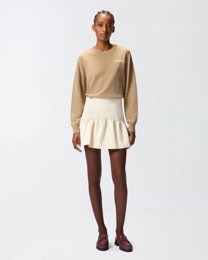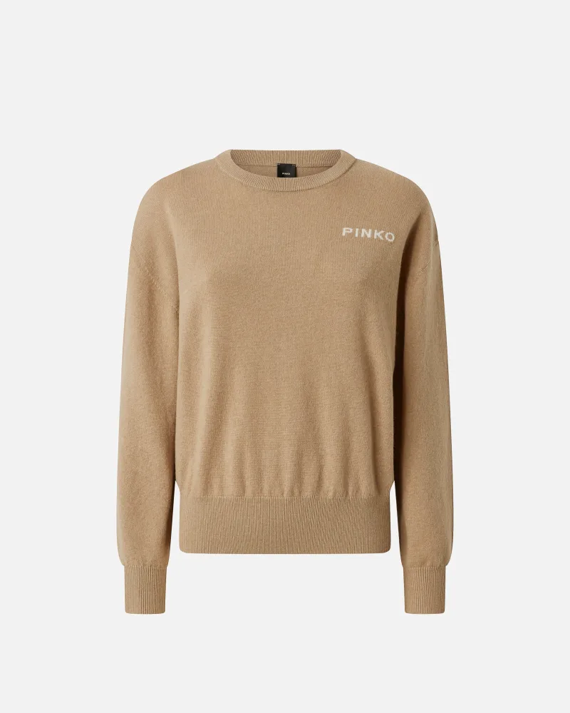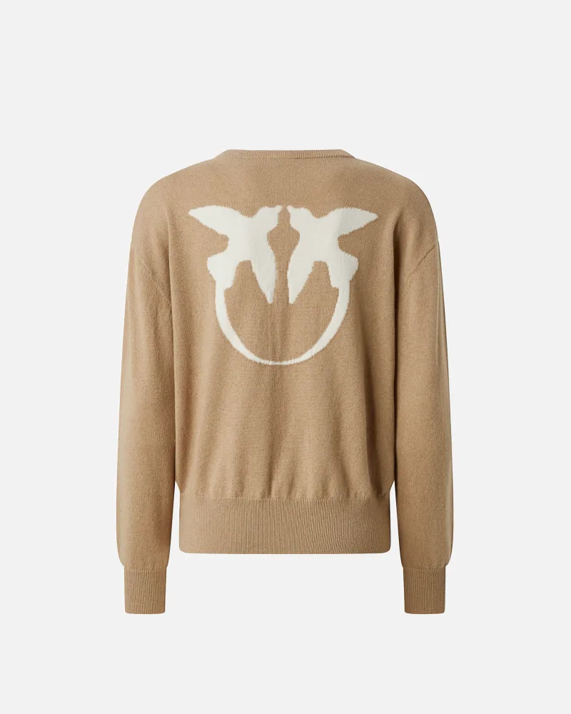 Πουλόβερ με μακριά μανίκια και στρογγυλή λαιμόκοψη από μείγμα λεπτού μαλλιού και κασμίρ. Το απαράμιλλο στυλ της μάρκας εκφράζεται στο έπακρο σε αυτό το ένδυμα, διακοσμημένο με το μάξι λογότυπο Love Birds στο πίσω μέρος και το λογότυπο PINKO με την αντίθετη επιγραφή στην μπροστινή αριστερή πλευρά. Το κομμάτι έχει υποβληθεί σε δοκιμές φινιρίσματος για την ελαχιστοποίηση του πιθανού σχηματισμού φουσκώματος, εξασφαλίζοντας μεγαλύτερη απαλότητα και ανθεκτικότητα του υφάσματος. Το σχέδιο ολοκληρώνεται με ριμπ στρογγυλή λαιμόκοψη, στρίφωμα και μανσέτες.