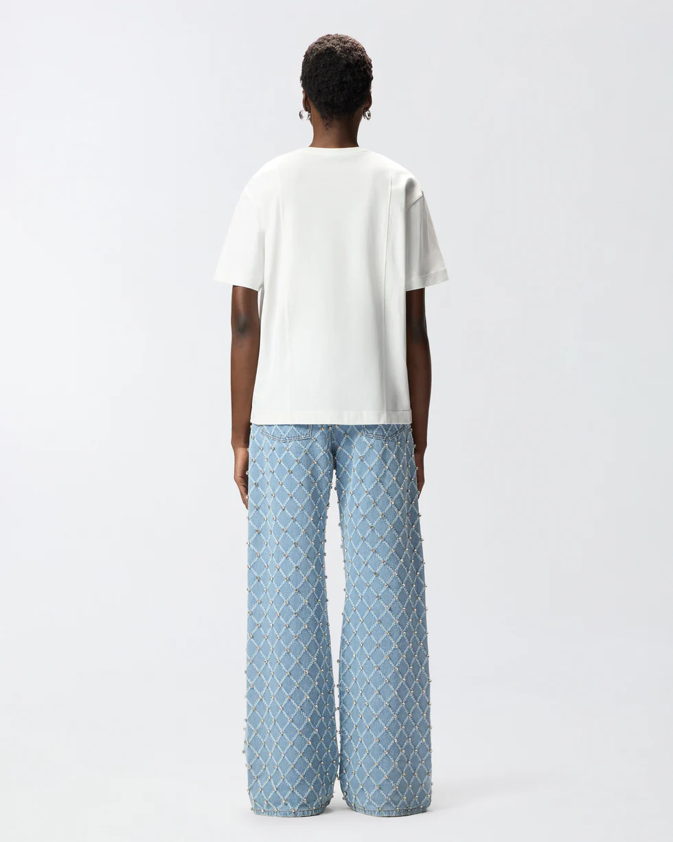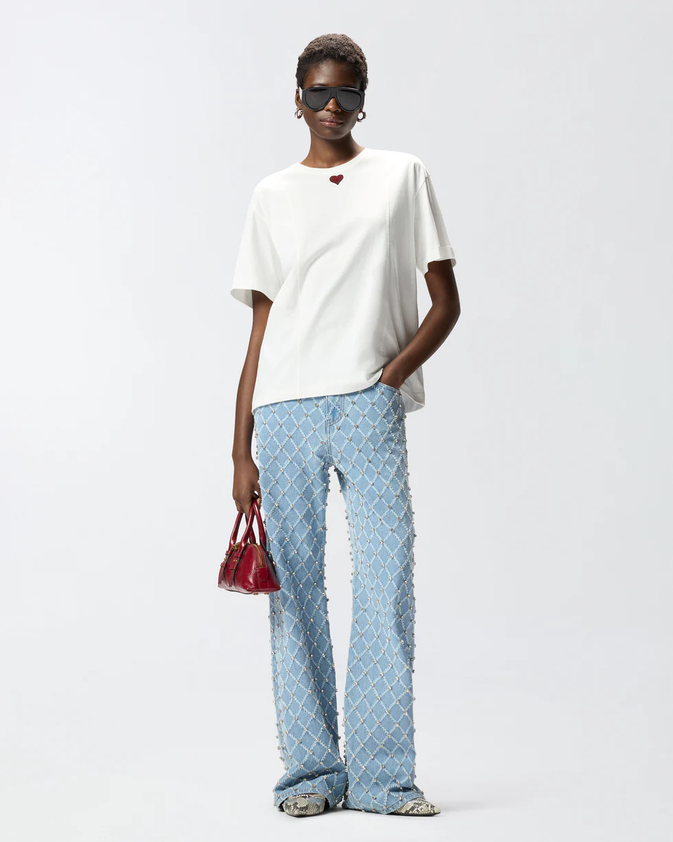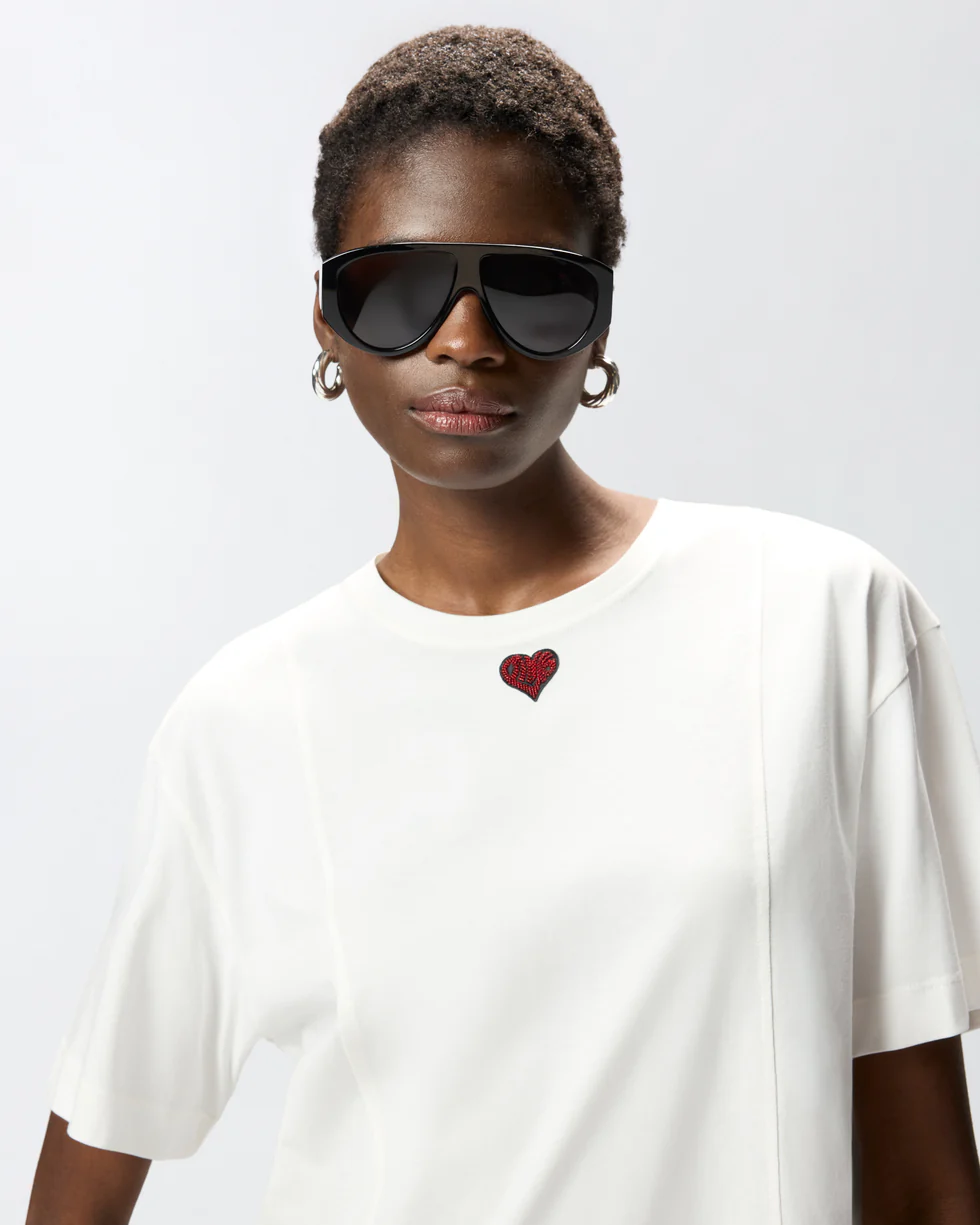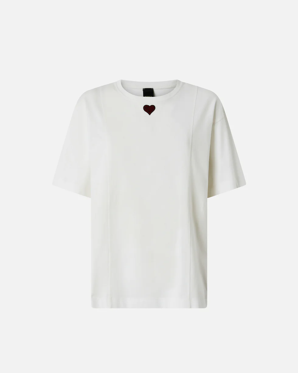 Κοντομάνικο t-shirt από καθαρό βαμβακερό ζέρσεϊ ύφασμα με στρογγυλή λαιμόκοψη, που χαρακτηρίζεται από μια κεντημένη καρδιά μπροστά. Ένα βασικό κομμάτι της γκαρνταρόμπας σε μια νέα έκδοση με το στυλ της PINKO, για πρακτικά και θηλυκά ταυτόχρονα, καθημερινά σύνολα.